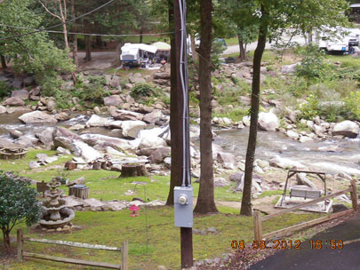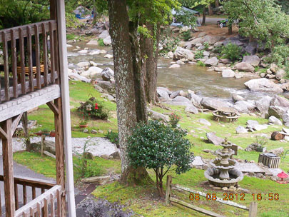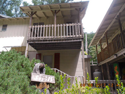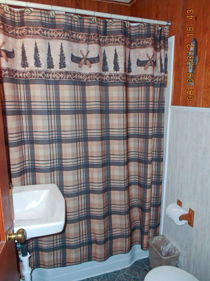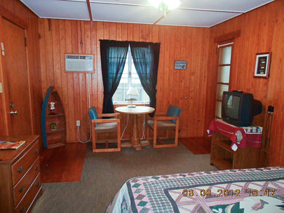 is decorated in a fisherman’s theme and features a queen bed with a fish quilt, knotty pine interior, table for two, mini refrigerator, microwave, Cable TV and covered balcony with river view.